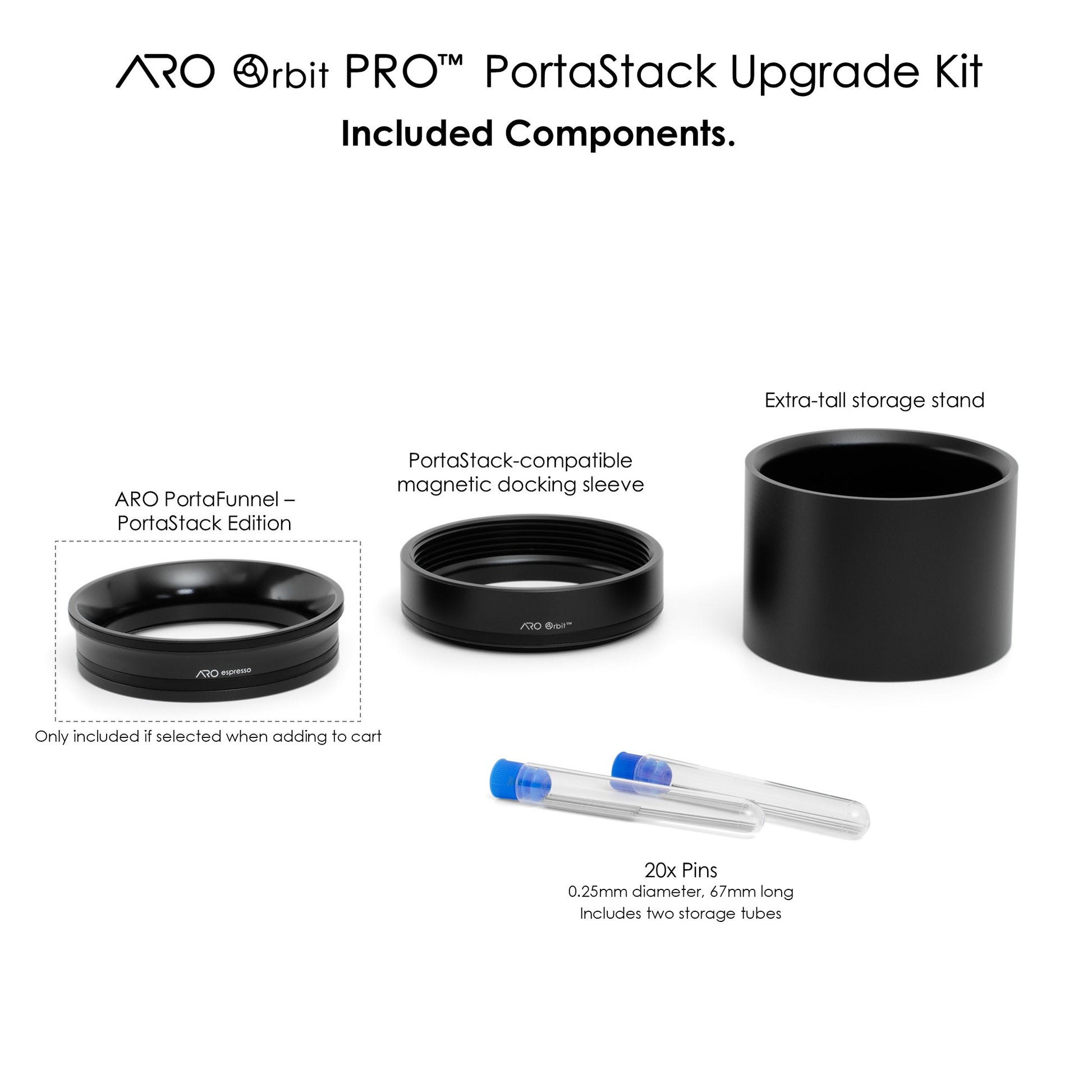 The ARO Orbit PRO™ PortaStack Upgrade Kit converts an existing ARO Orbit PRO™ for compatibility with the ARO PortaStack system. This kit replaces the standard magnetic sleeve used for connection with an espresso basket with a magnetic docking sleeve, allowing the Orbit PRO™ to dock directly to the ARO® PortaFunnel – PortaStack Edition. It also includes extra-long pins and an extra-tall storage stand, designed to accommodate the added height introduced by the PortaFunnel.